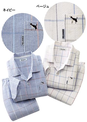 初夏をクールに着こなす大人のパジャマ ネイビー、ベージュの涼しげな2色セットです 【シアサッカー】 強く張った撚糸と緩く張った撚糸を交互に織り、平らな部分と緩んだ部分が生み出した凹凸が特徴の生地。